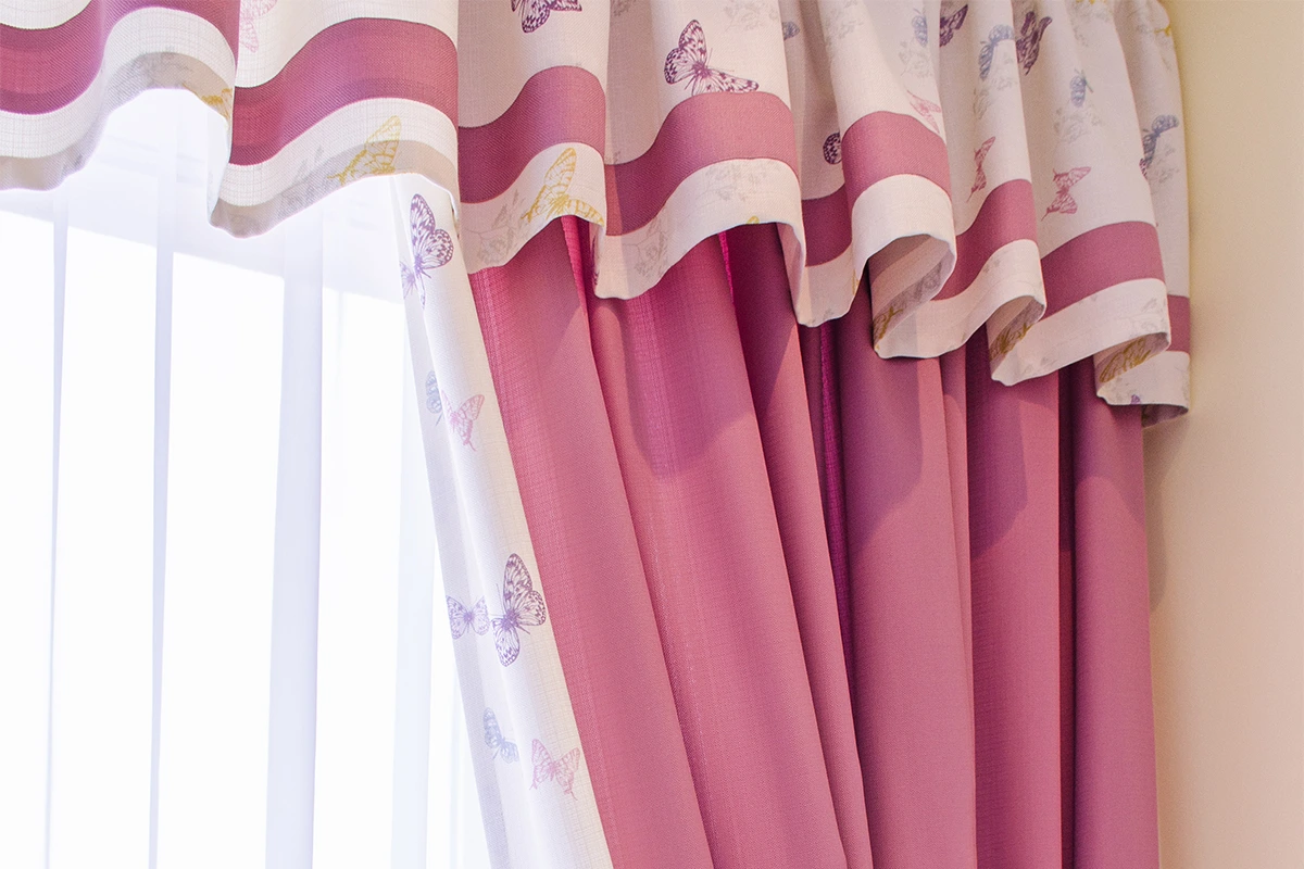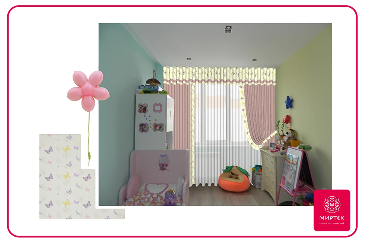 Предварительные фото и проведение замеров обозначили приоритеты. Мы заметили, что даже пол имеет розовый оттенок. Да и в мебели использованы варианты розового. Конечно для юной игруньи мы выбрали базовый цвет штор – благородный розовый. Чтобы шторы не получились большим скучным розовым пятном, добавили отделочные элементы из того же материала, что и основные шторы, только с принтом в виде невесомых бабочек. Шторы можно драпировать подхватами или полностью закрывать окно в зависимости от сценария игры в комнате. Ну и обязательный элемент – ламбрекен, размеры точно соответствуют золотому сечению для идеального визуального восприятия. Ламбрекен выполнен из принтованной ткани с бабочками и очень удачно отделан полосой ткани основного цвета портьер. Белый тюль смягчает активные солнечные лучи. Таким образом будуар для юной принцессы Сибири получил свой финальный облик на ближайшие 4 года.