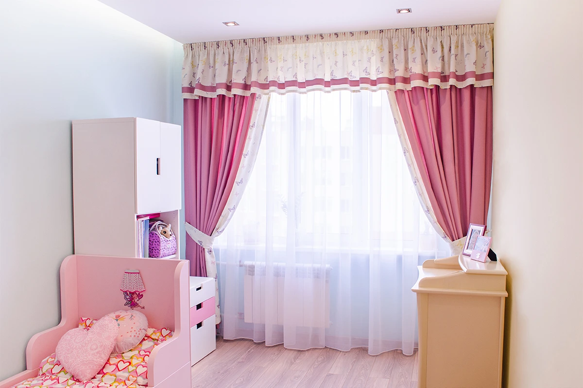 Про учебу думать еще рано, обстановка к школе будет обновлена. Сделайте шторы для беззаботной жизни девочки от 2-х до 6-ти лет.