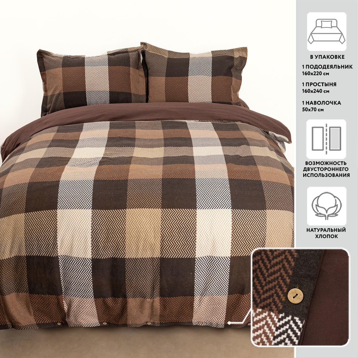 Постельное белье 1,5-спальное МИРТЕК WINTER FLANNEL CUBIC 160х220-1шт 160х240-1шт 50х70-1шт 100%хлопок коричневый