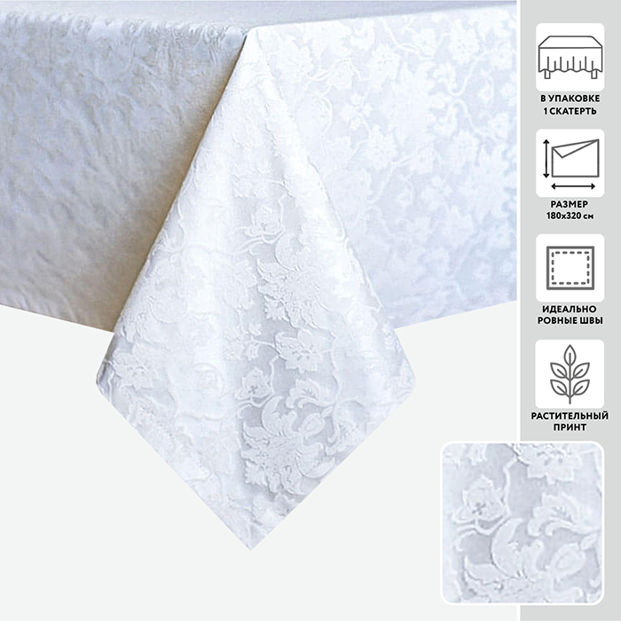 Однотонная скатерть с классическим жаккардовым узором – базовая вещь для оформления праздничного стола. Добавьте салфетки, конверты для столовых приборов и даже самые взыскательные гости Вас похвалят!