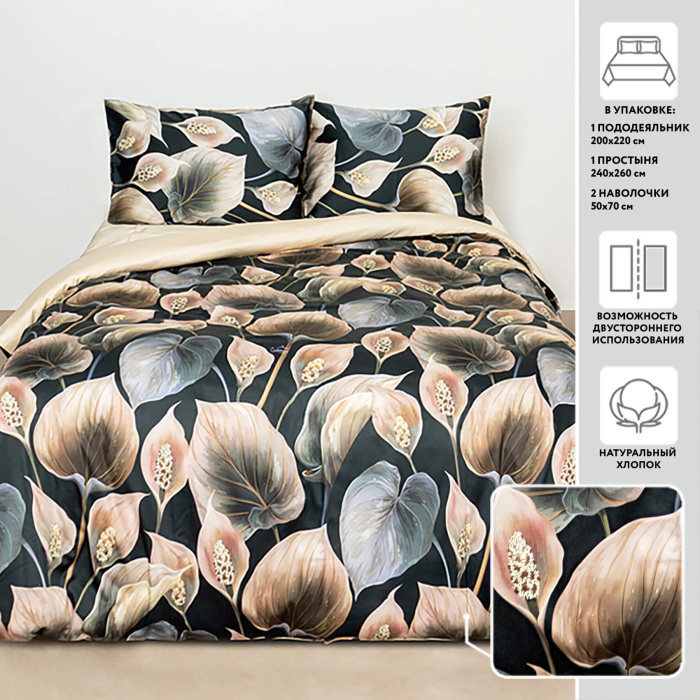 Постельное белье ЕВРО МИРТЕК КАЛЛЫ представляем из прочной и мягкой ткани САТИН - 100% хлопок. Модель с ярким принтом и двусторонним пододеяльником легко преобразит интерьер и подарит крепкий, здоровый сон. Комплект из Столицы текстильных идей МИРТЕК оценят друзья, коллеги и близкие как приятный и полезный подарок день рождения, свадьбу, юбилей. Порадует и легкий уход: стирка на деликатном режиме при 30-40С, без использования отбеливателей. Белье предлагаем в ЕВРО размере: пододеяльник 200х220-1шт, с простыней без резинки 240x260-1шт, наволочка 50х70-2шт.