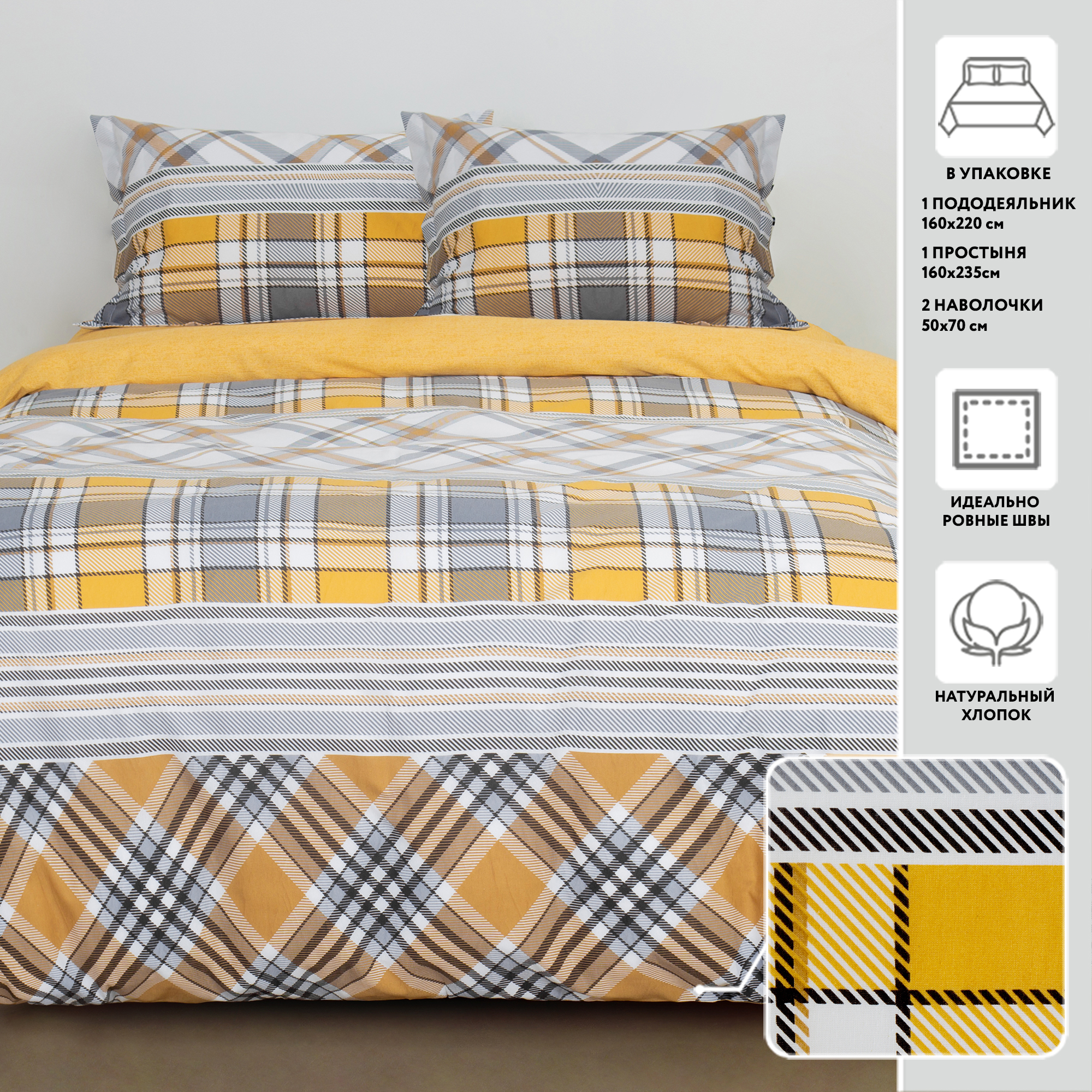 Постельное белье 1,5-спальное МИРТЕК EVERYDAY TARTAN 160х220-1шт 160х235-1шт 50х70-2шт 70%хлопок 30%пэ желтый