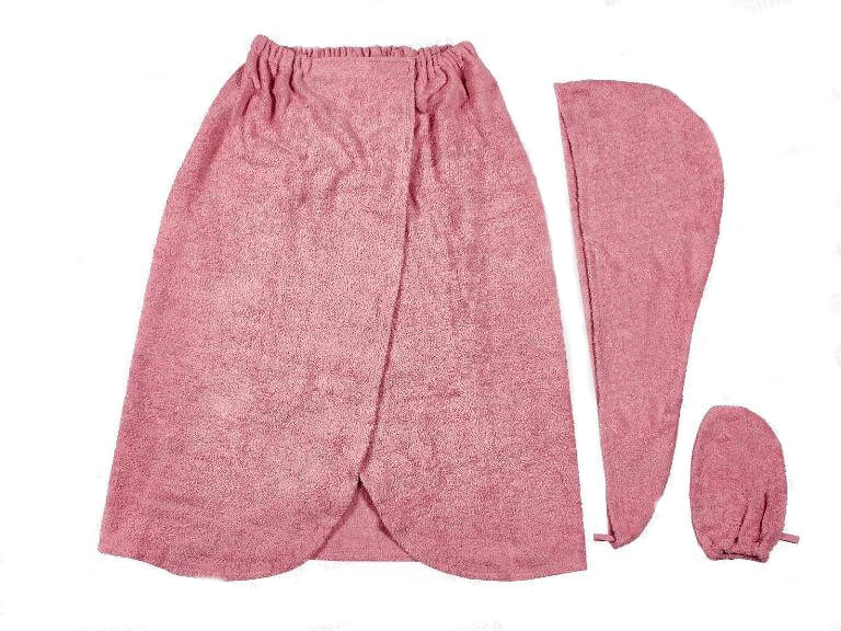 Комплект для сауны состоит из парео размером 42-54, чалма на голову и варежка-мочалка.