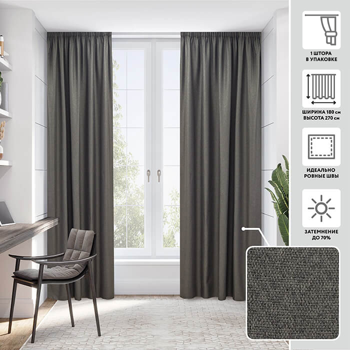 Она состоит из трёх слоев волокон с особым тёмным слоем внутри. Благодаря такому строению, шторы-блэкаут способны эффективно поглощать солнечный свет до 100%! А ещё, засчет плотности, они помогут регулировать температуру в комнате, удерживая теплый воздух внутри в зимнее время года, и оставляя знойную жару за окном летом.