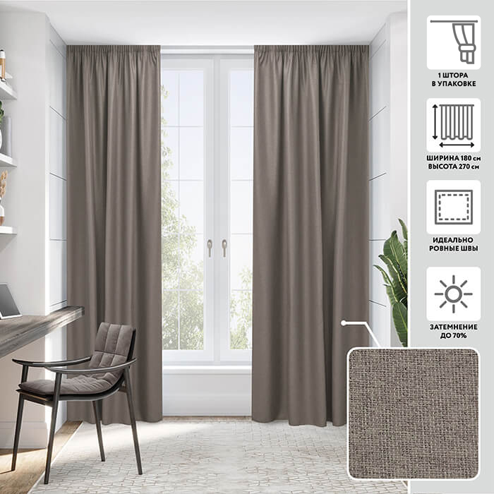 Она состоит из трёх слоев волокон с особым тёмным слоем внутри. Благодаря такому строению, шторы-блэкаут способны эффективно поглощать солнечный свет до 100%! А ещё, засчет плотности, они помогут регулировать температуру в комнате, удерживая теплый воздух внутри в зимнее время года, и оставляя знойную жару за окном летом.