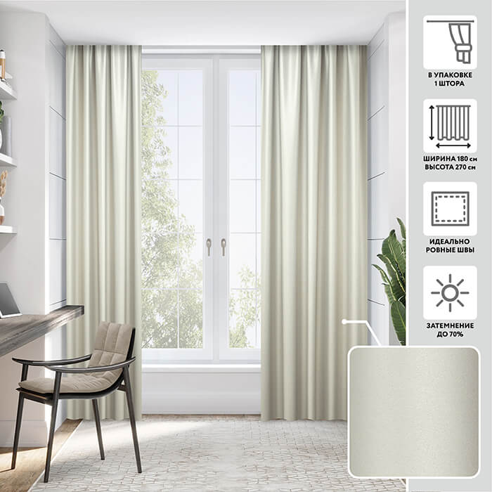 Плотные шторы из ткани блэкаут с деликатным жемчужным блеском на 70 % защищают от проникновения в комнату прямых солнечных лучей.Стильные оттенки штор великолепно подойдут для любых интерьеров. Шторы устойчивы к выцветанию и загрязнениям, не деформируются после стирки. Приятная на ощупь гладкая поверхность отлично драпируется, а отсутствие ворсинок на поверхности ткани делает шторы гипоалергенными.