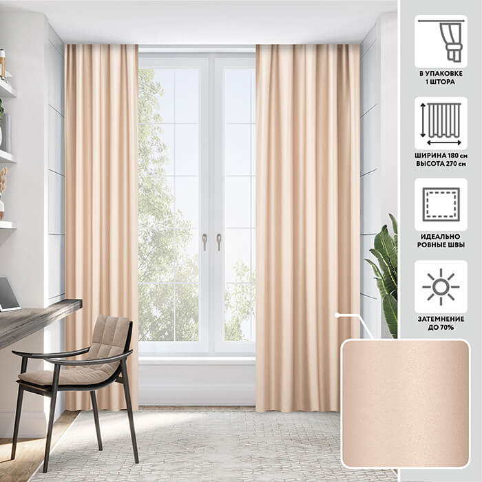 Плотные шторы из ткани блэкаут с деликатным жемчужным блеском на 70 % защищают от проникновения в комнату прямых солнечных лучей.Стильные оттенки штор великолепно подойдут для любых интерьеров. Шторы устойчивы к выцветанию и загрязнениям, не деформируются после стирки. Приятная на ощупь гладкая поверхность отлично драпируется, а отсутствие ворсинок на поверхности ткани делает шторы гипоалергенными.