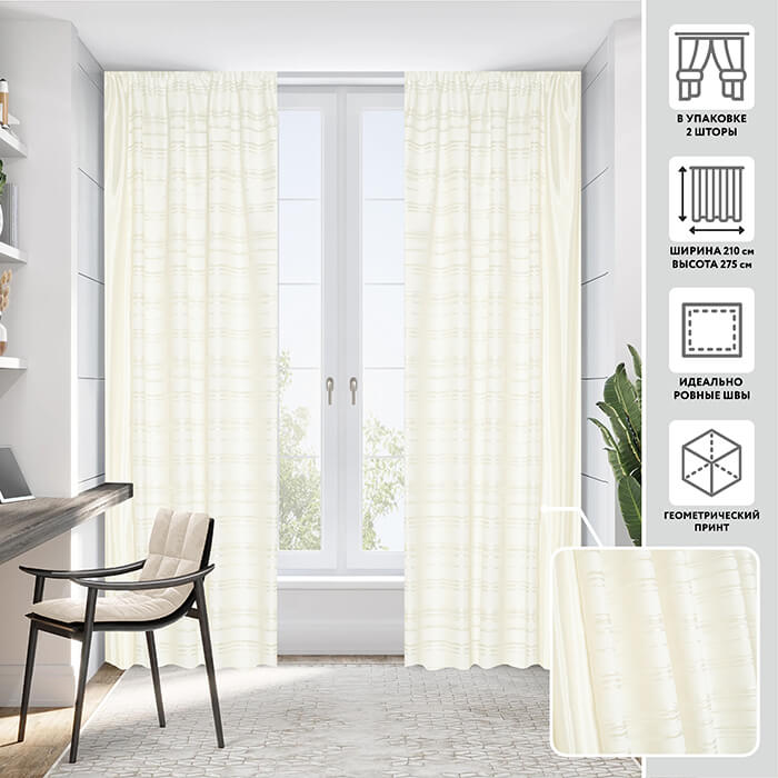 Ровные складки образуются благодаря удобной шторной ленте, пришитой по верхнему краю.