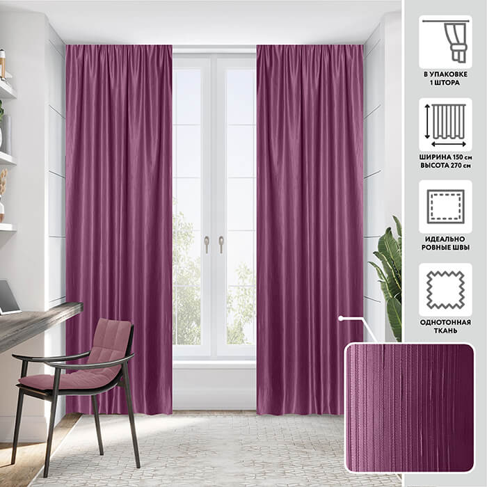 Портьеры из плотной ткани с деликатным сатиновым блеском отличаются интересной фактурой в виде вертикальных рубчиков. Шторы хорошо драпируются и отлично защищают от солнечного света. Цветовая палитра позволяет легко комбинировать полотна между собой. Отличное решение для современного интерьера!