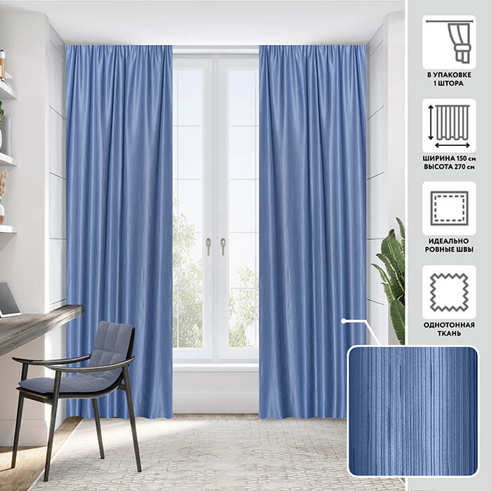 Портьеры из плотной ткани с деликатным сатиновым блеском отличаются интересной фактурой в виде вертикальных рубчиков. Шторы хорошо драпируются и отлично защищают от солнечного света. Цветовая палитра позволяет легко комбинировать полотна между собой. Отличное решение для современного интерьера!