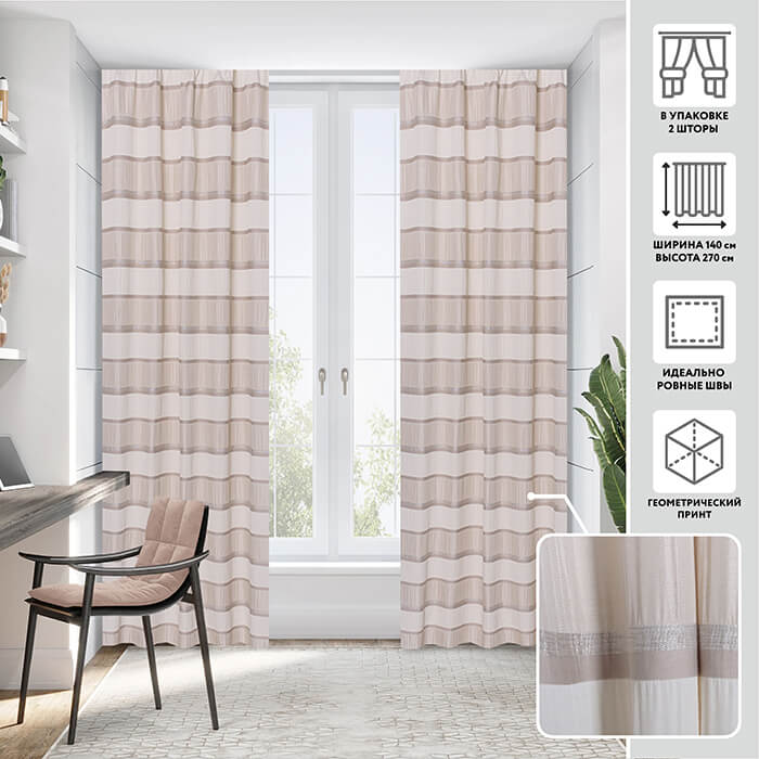 Комплект штор из плотной ткани с оригинальным рисунком в виде горизонтальной полоски. Эти портьеры легко позволят изменить пропорции интерьера, визуально расширив пространство.Шторы легко стирать, они отлично держат форму драпировки, не теряют яркости принта со временем.