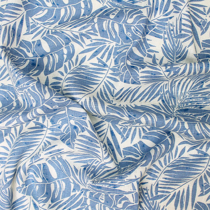 Костюмный лён представляет собой прочную, мягкую и приятную на ощупь материю с тропическим принтом в виде листьев. Благодаря составу из 100% вискозы ткань обладает такими свойствами, как гипоаллергенность, гигроскопичность и воздухопроницаемость, пластичность и малосминаемость. Перед раскроем льна рекомендована декатировка ввиду склонности к усадке. Ткань лён идеально подходит для пошива летней женской одежды (платья, сарафана, блузки, юбки, брюк, шорт и ночной сорочки). Готовые изделия из вискозного льна легкие и воздушные, поэтому дарят ощущение прохлады в летние жаркие дни. Костюмную ткань из вискозы разрешено стирать вручную и в стиральной машине на деликатном режиме в воде с t не более 30 градусов. Материал запрещено выжимать и выкручивать. Для стирки рекомендовано использовать мягкие гелевые средства и кондиционер для полоскания. Гладить вискозный лен разрешено с изнанки через увлажненную тонкую материю утюгом t 150 градусов на режиме "Шелк".