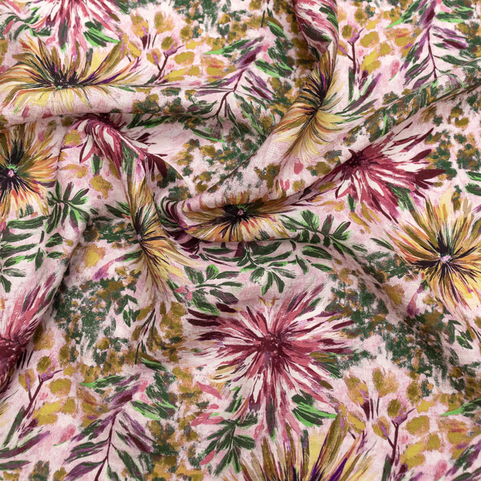 ПЛАТЬЕВАЯ КРЕП НАБИВНОЙ ш140 100%вискоза (цветы/малиновый/св.желтый)