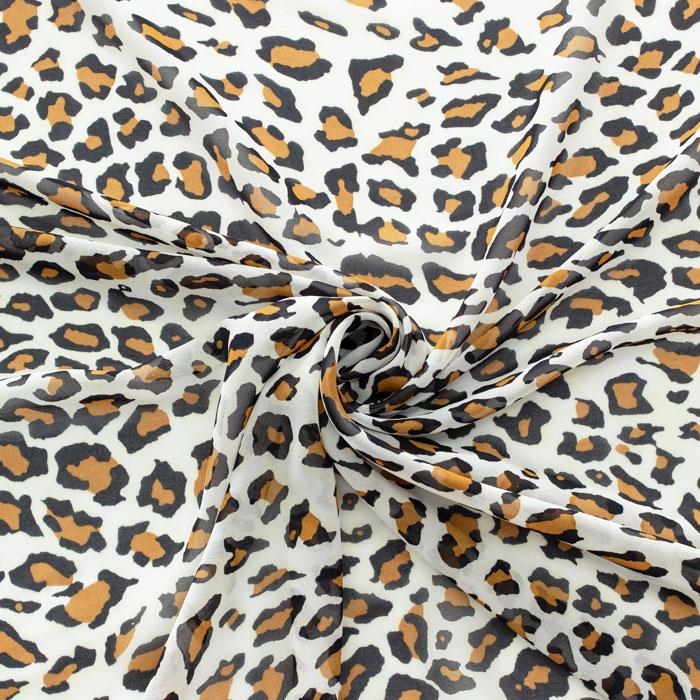 Набивной шифон представляет собой тонкий полупрозрачный материал из полиэстера с анималистическим (животным) принтом в виде леопардовых пятен. Ткань обладает такими свойствами, как воздухопроницаемость, малосминаемость и упругость. Шифону присуща шелковистость и мягкость на ощупь. Шифон подходит для пошива летнего платья и сарафана, блузки, топа и юбки, платка и шарфа. Шифон требует бережного ухода: ручная или машинная стирка на режимах "Деликатный" и "Ручной" в воде t 30 градусов; использование жидкого геля для стирки и кондиционера для полоскания; запрещены сильный отжим и выкручивание, разрешен отжим в стиральной машине на 400 оборотов; глажка на режиме "Шелк" через влажную или сухую марлю.